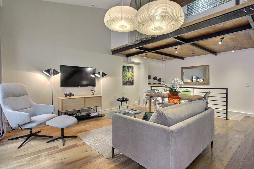 L’appartement, bien que situé au rez-de-chaussée, surprend par son agencement sur trois niveaux, apportant une touche d’originalité à cet espace unique. La pièce principale, baignée de lumière naturelle, offre un espace de vie convivial où se mêlent harmonieusement le salon, la cuisine toute équipée et le coin repas. La très grande hauteur sous plafond offre un aspect loft à cet appartement. Près de l’escalier menant à la chambre, on trouve également un coin bureau.
